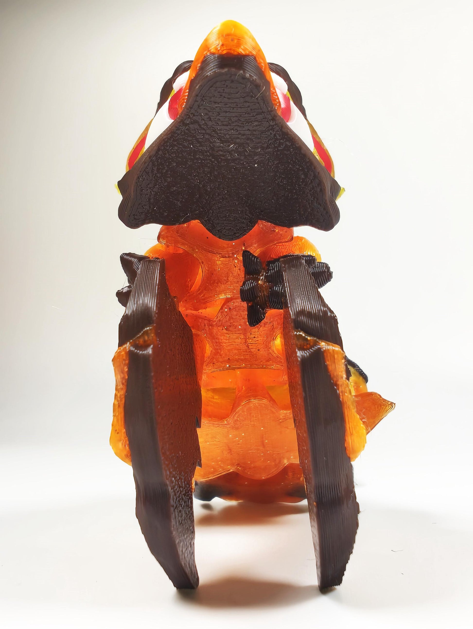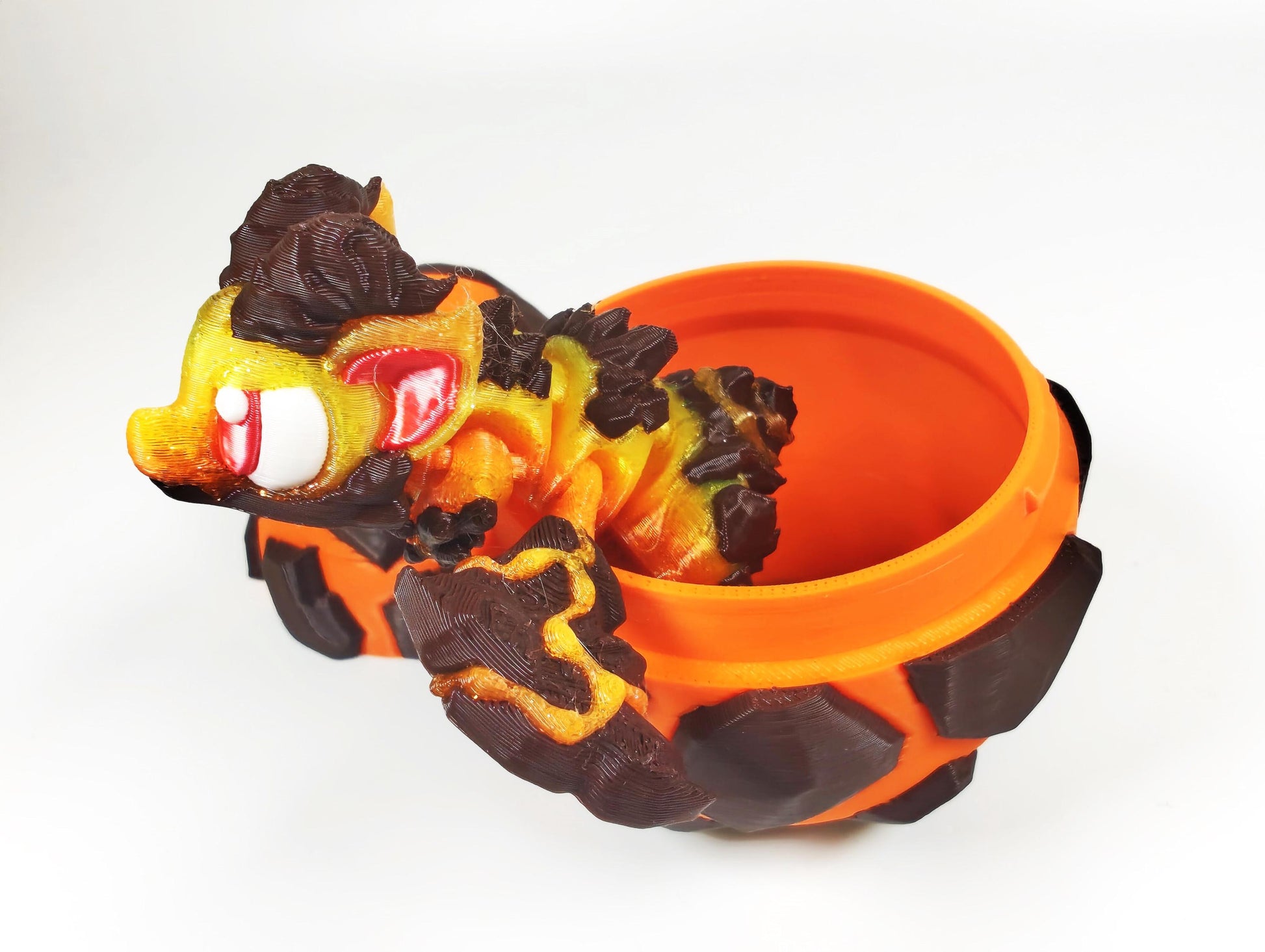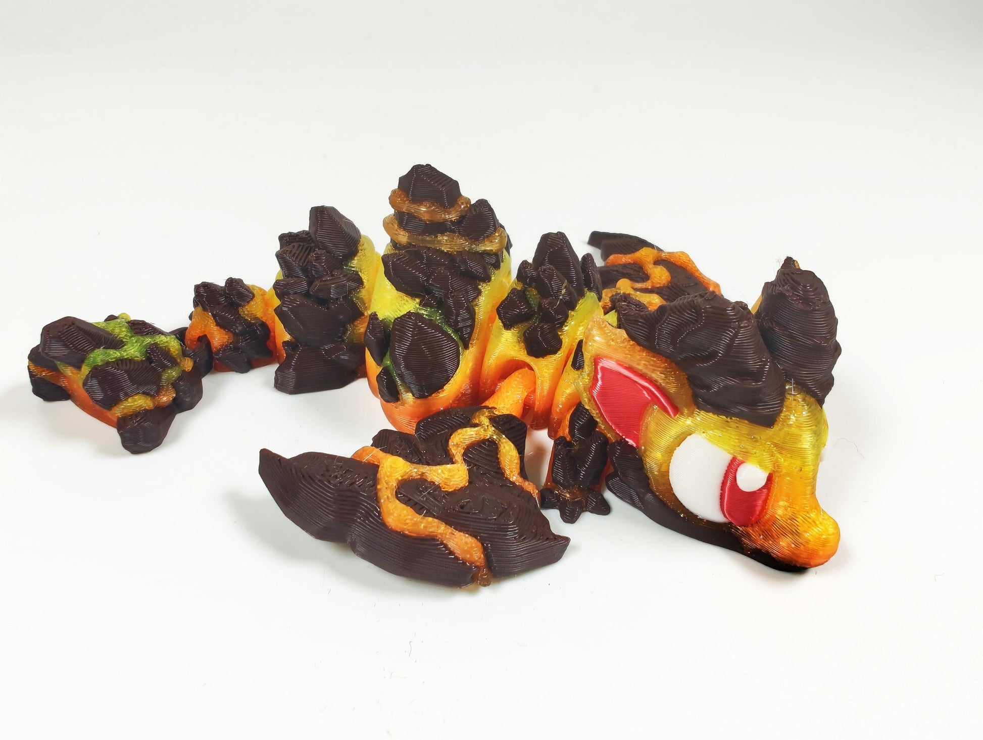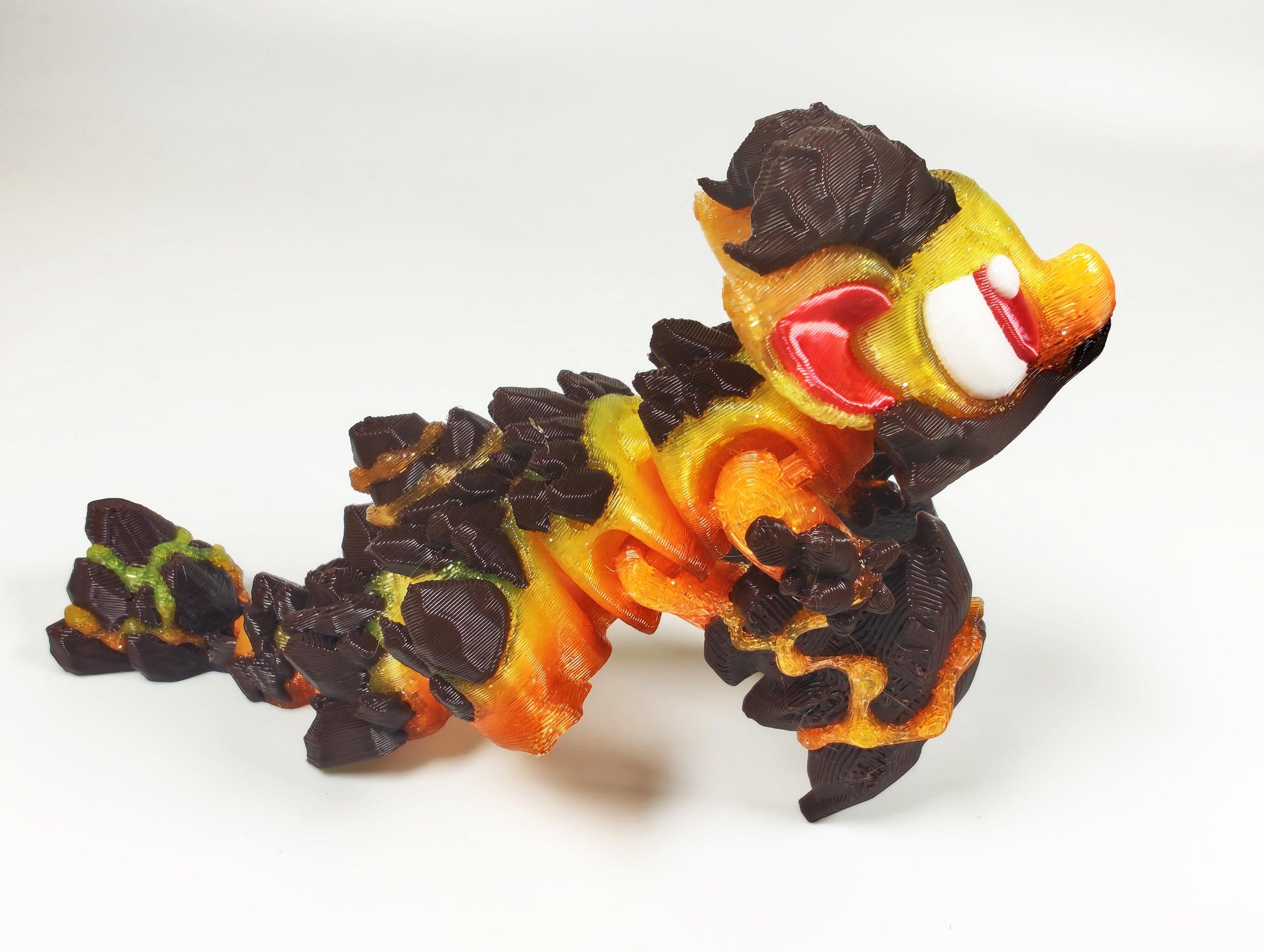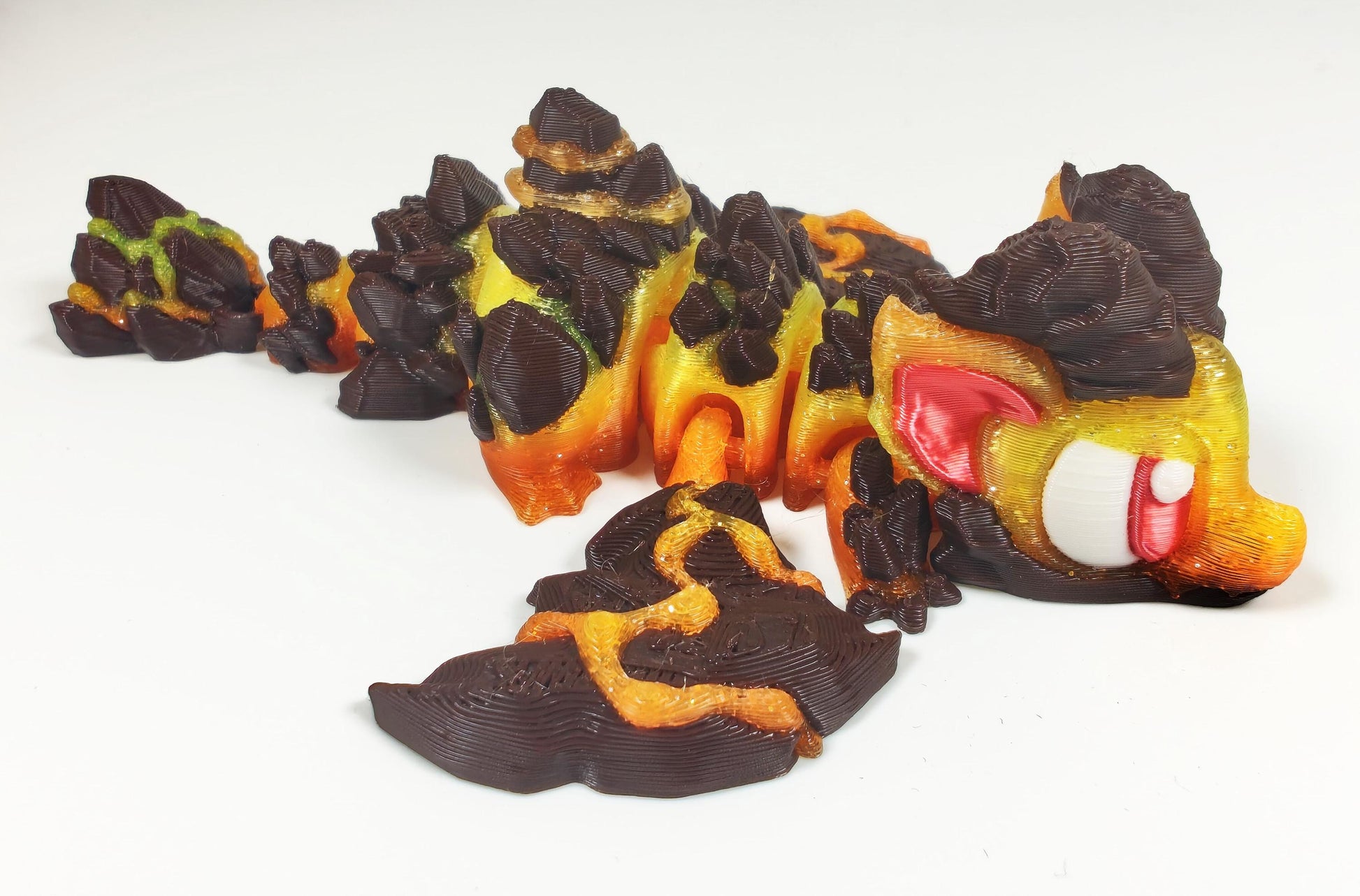 Crafted with a translucent gradient filament, this dragon glows with fiery hues that burst like flowing lava, perfectly contrasted by rich, chocolate brown rock accents. It’s ideal for those who love bold fantasy art with a spark of edgy energy.