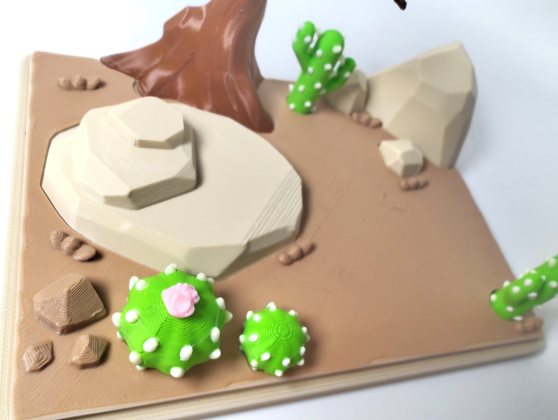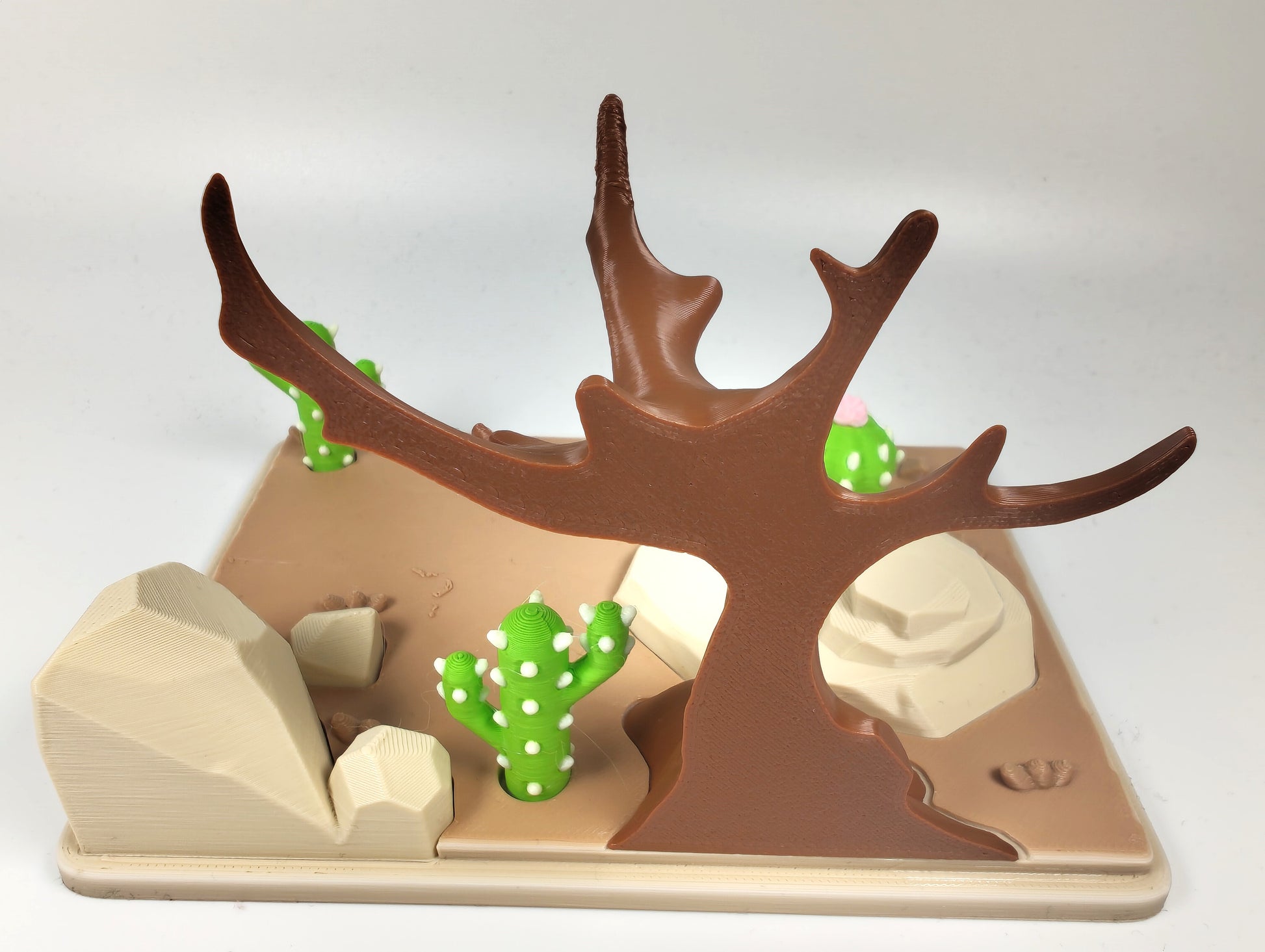 Step into a sun-soaked scene with Armadillo Desert – a charming 3D printed diorama featuring two fully articulated armadillo fidget friends. With a sandy base, spiky cacti, scattered rocks, and a gnarled desert tree, this interactive set brings the warmth and whimsy of the wild west right to your shelf or workspace.