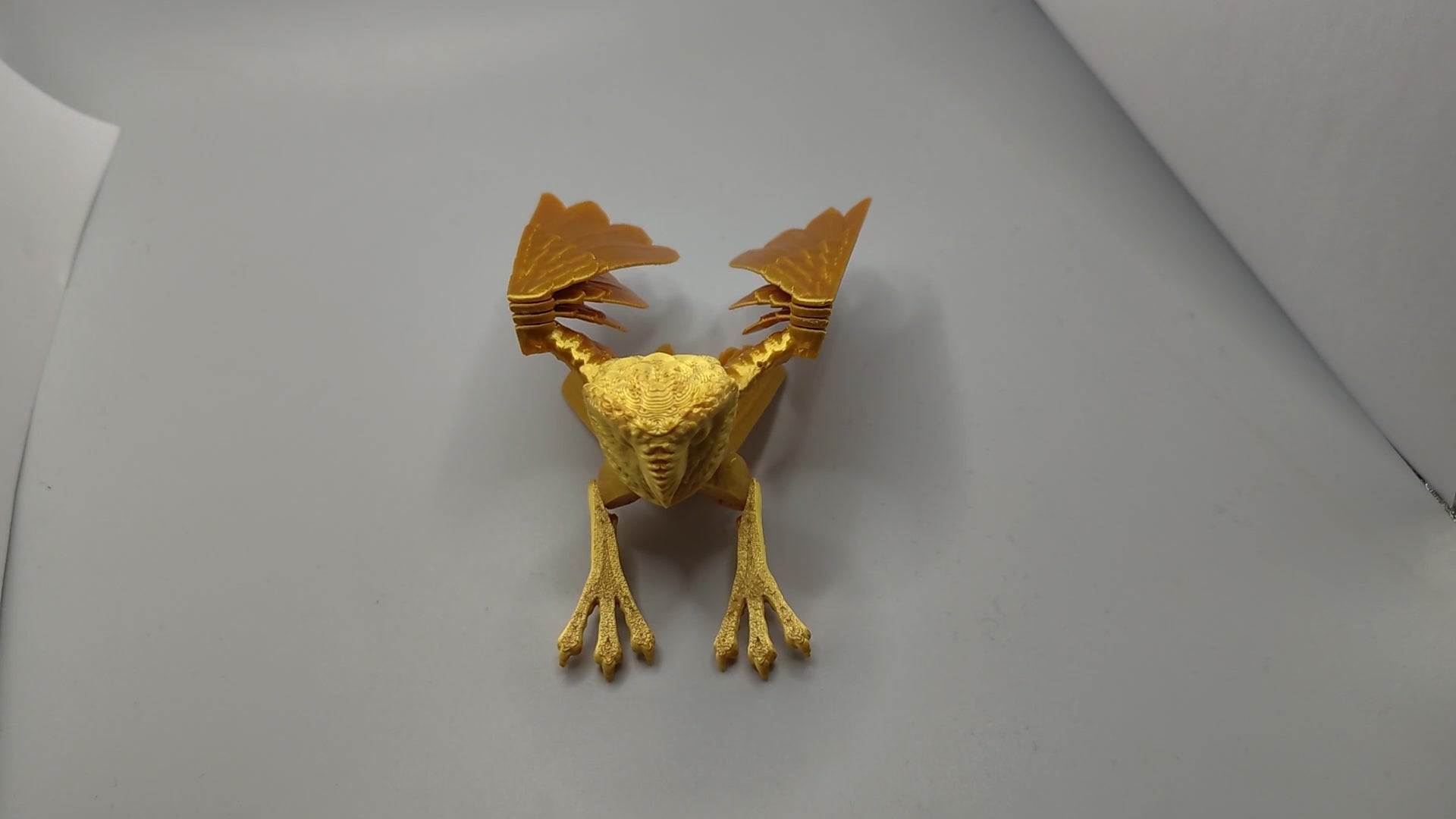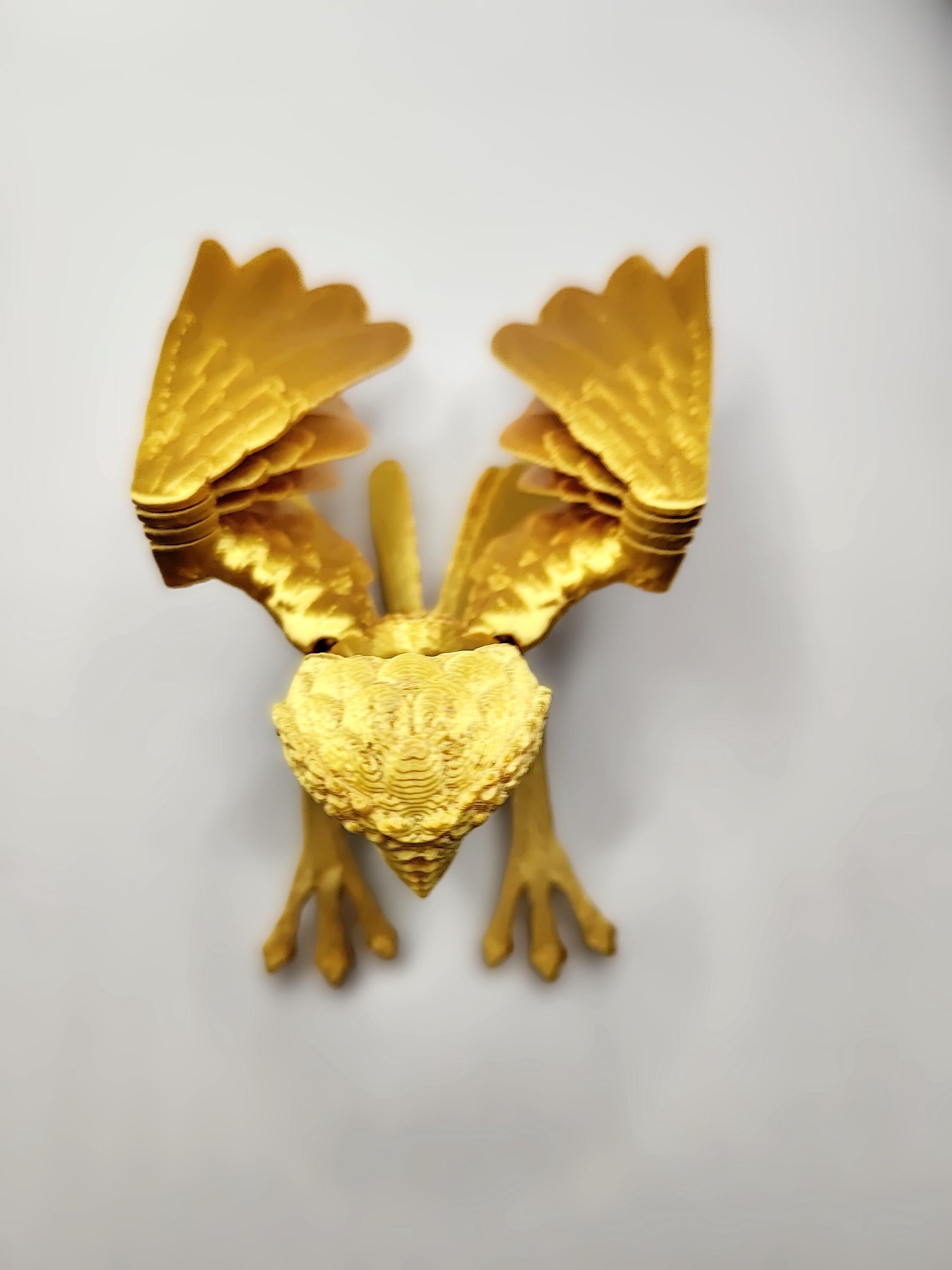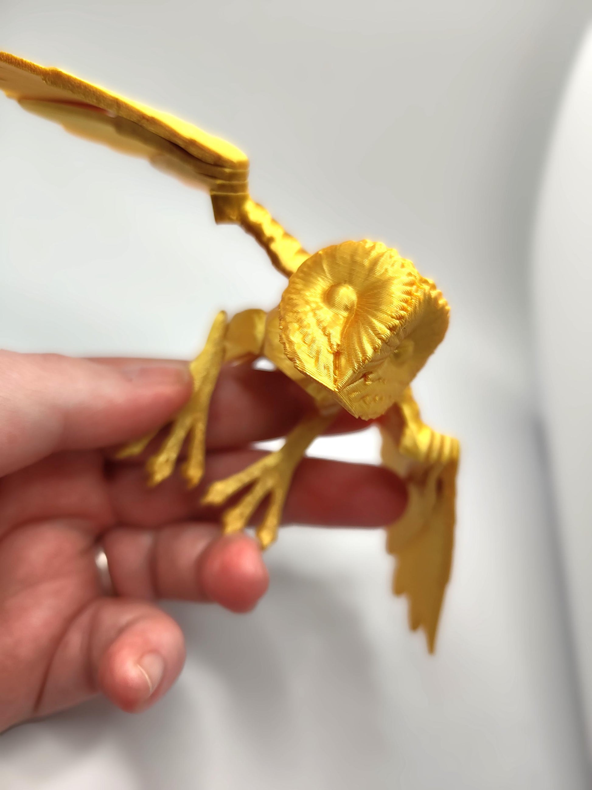 Capture the magic of the barn owl in a compact, highly detailed, and fully poseable form! This miniature version of our popular articulated owl is 3D printed in stunning gold PLA, making it a beautiful display piece or fidget item. While smaller in size, it still features movable wings, individual feathers, a poseable head, and a flexible tail.