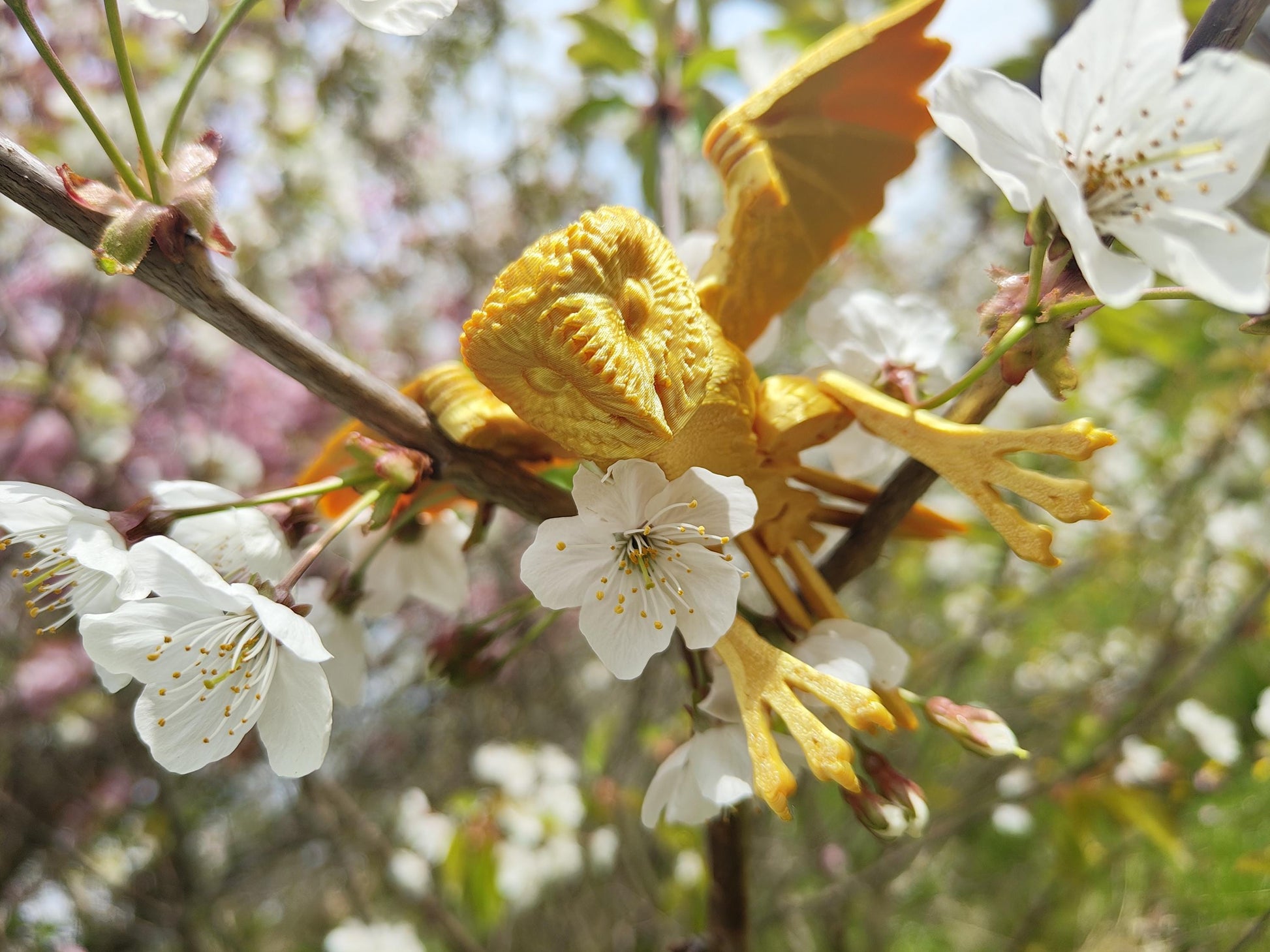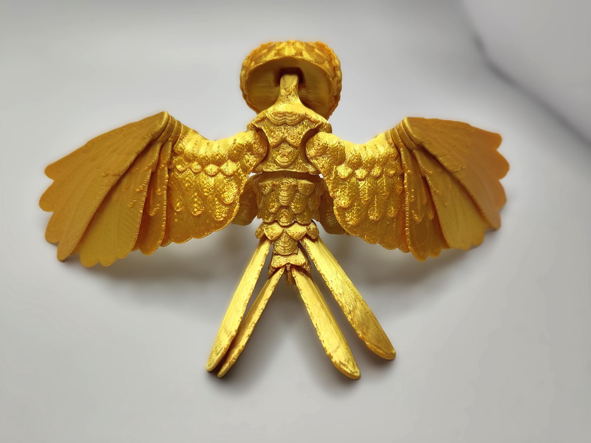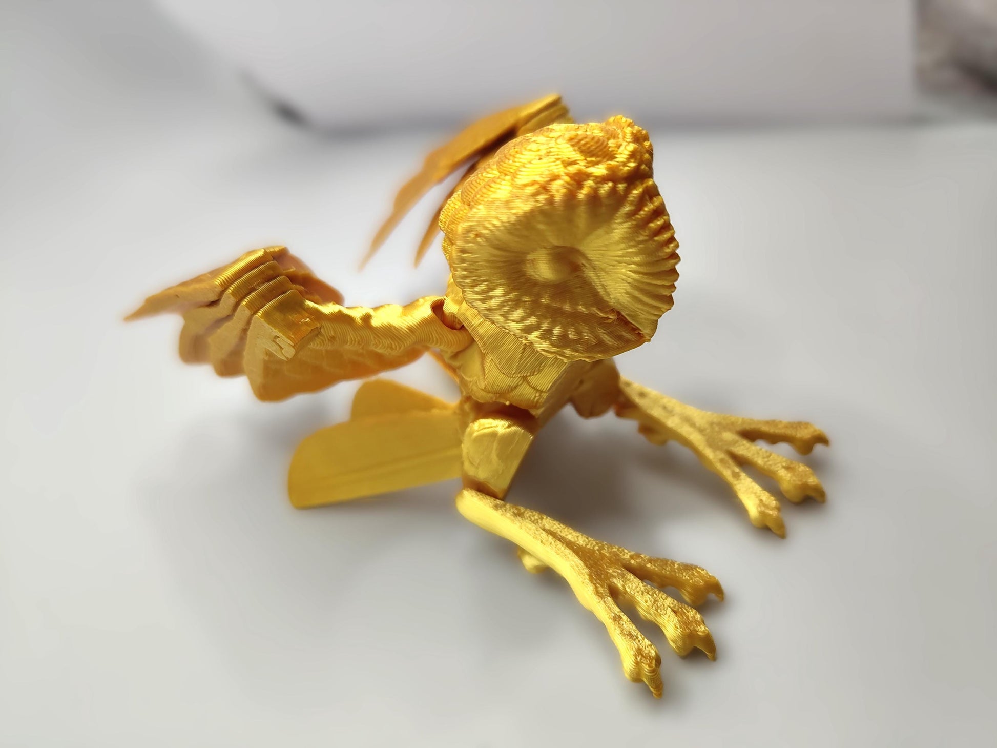 Capture the magic of the barn owl in a compact, highly detailed, and fully poseable form! This miniature version of our popular articulated owl is 3D printed in stunning gold PLA, making it a beautiful display piece or fidget item. While smaller in size, it still features movable wings, individual feathers, a poseable head, and a flexible tail.