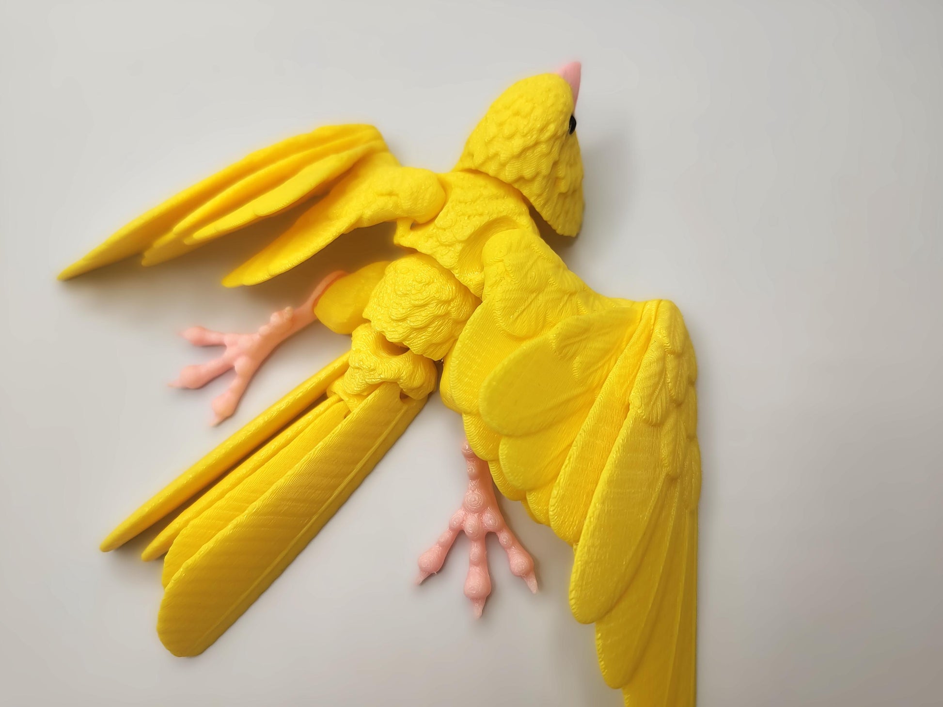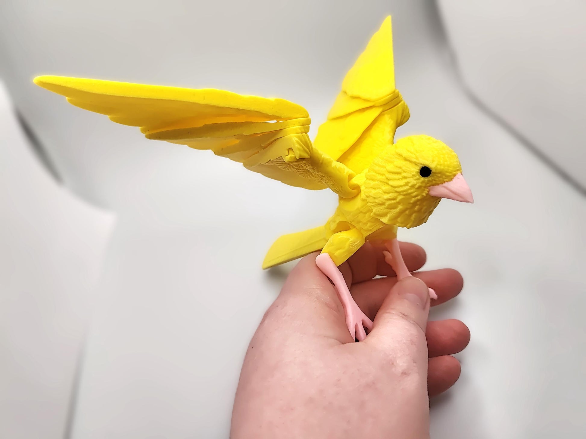 Bring a touch of sunshine into your space with this beautifully detailed 3D-printed articulated canary! With its cheerful presence and fully poseable design, this little songbird features moving wings, individual wing feathers, tail feathers, and a turnable head—perfect for display, fidgeting, or creative photography.