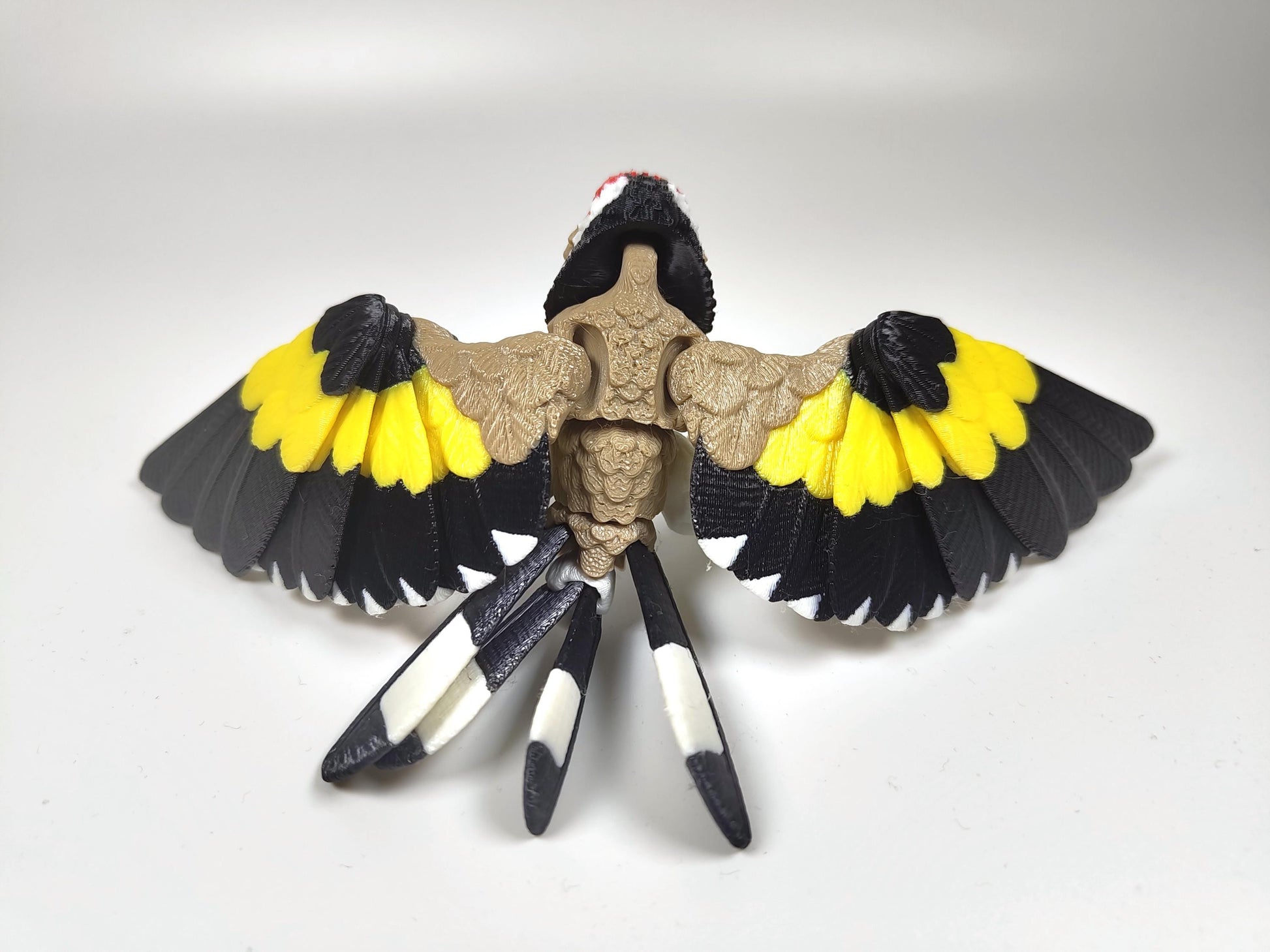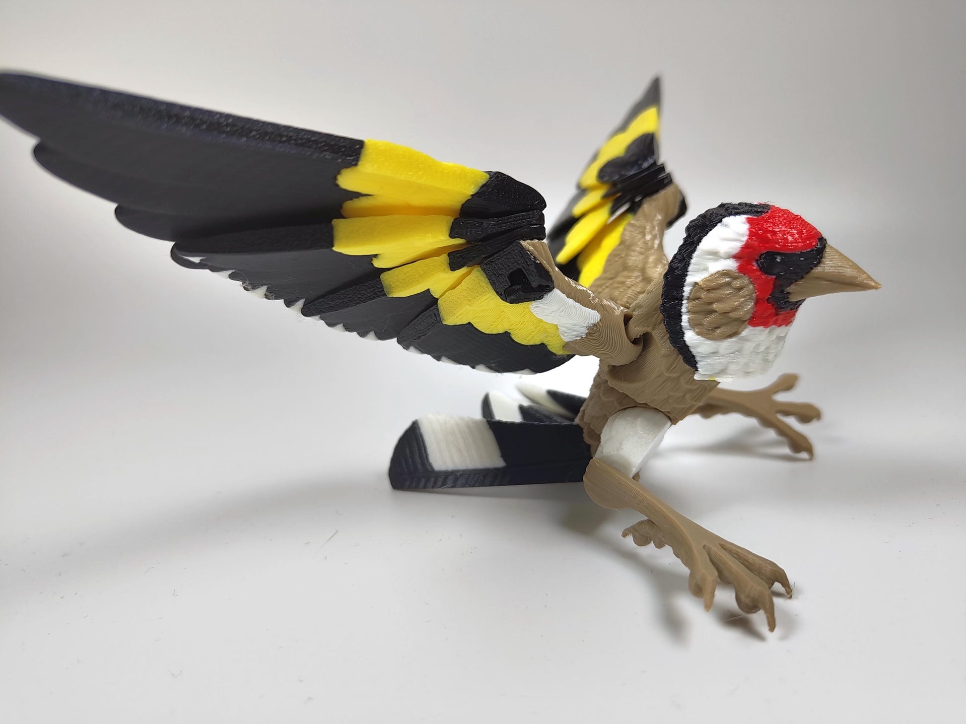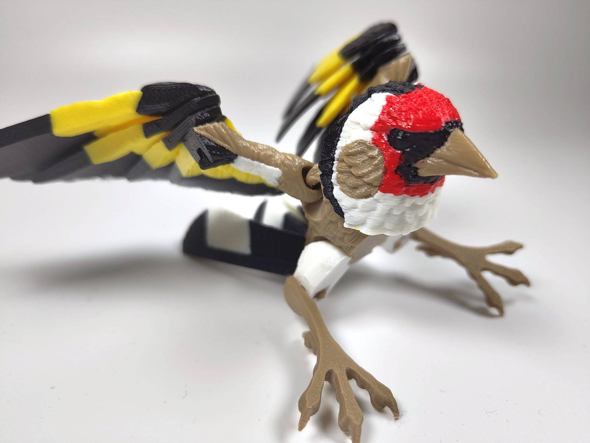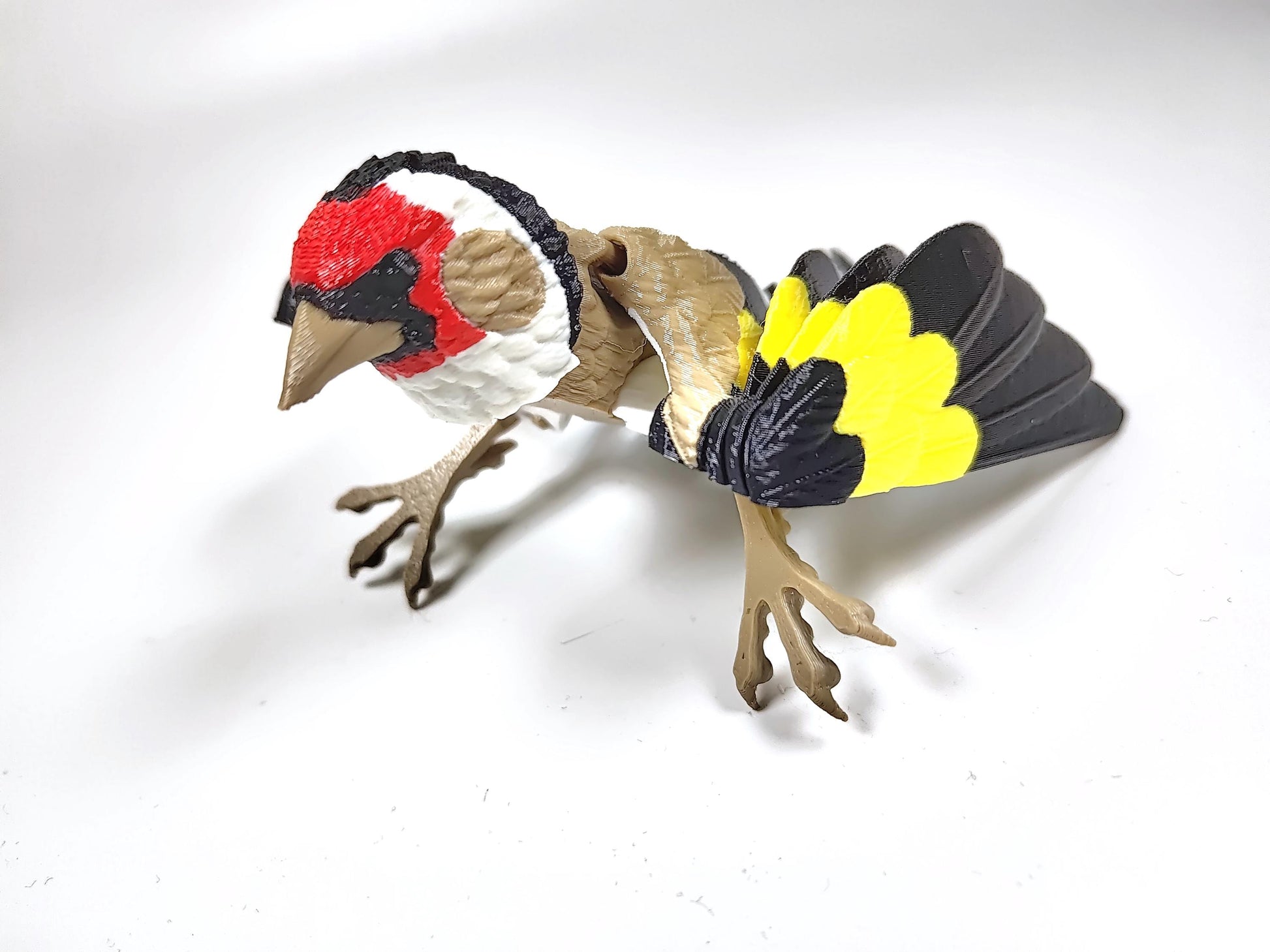 Bring the vibrant charm of the European goldfinch to life with this fully articulated 3D-printed model, featuring selectively hand-painted details to enhance realism. With lifelike articulation in the wings, feathers, and head, this charming figure is ideal for display, gentle fidgeting, or creative photography.