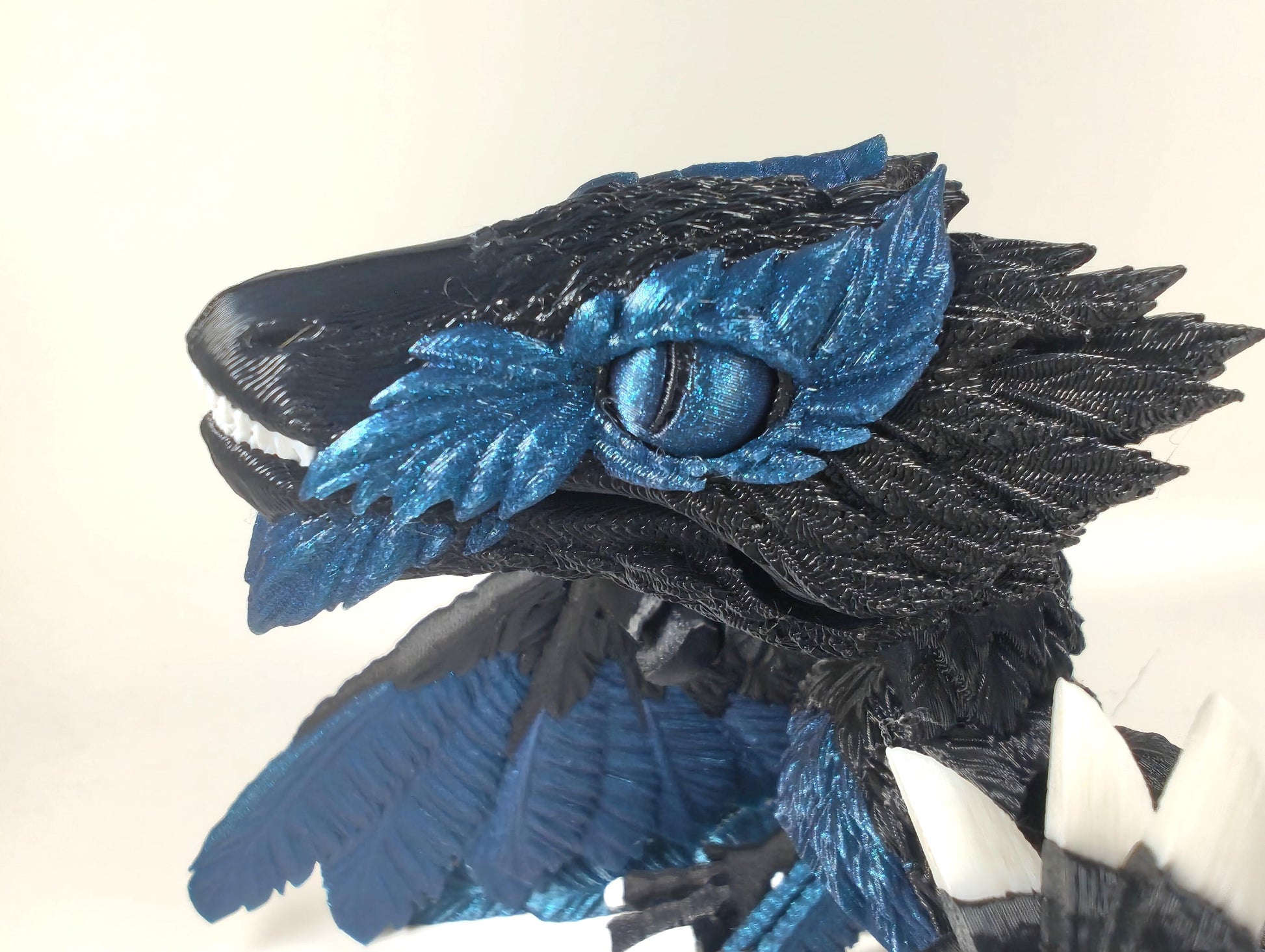 Unleash prehistoric style with this striking articulated microraptor, 3D printed in a sleek black filament and packed with personality. This small but mighty dino-bird features a hinged spring jaw for dynamic poses, dramatic white claws and teeth, and customisable feather accents to make it uniquely yours.