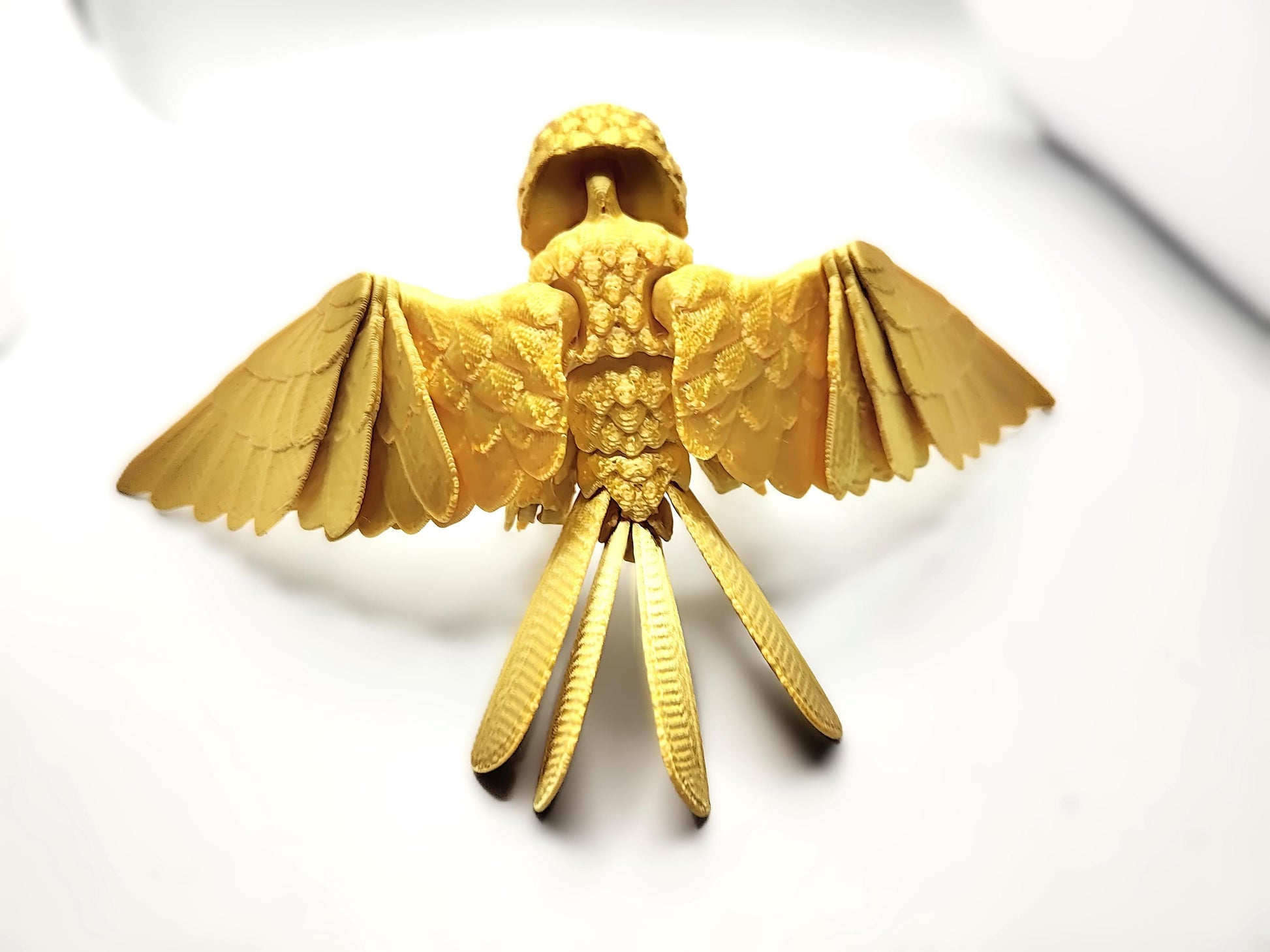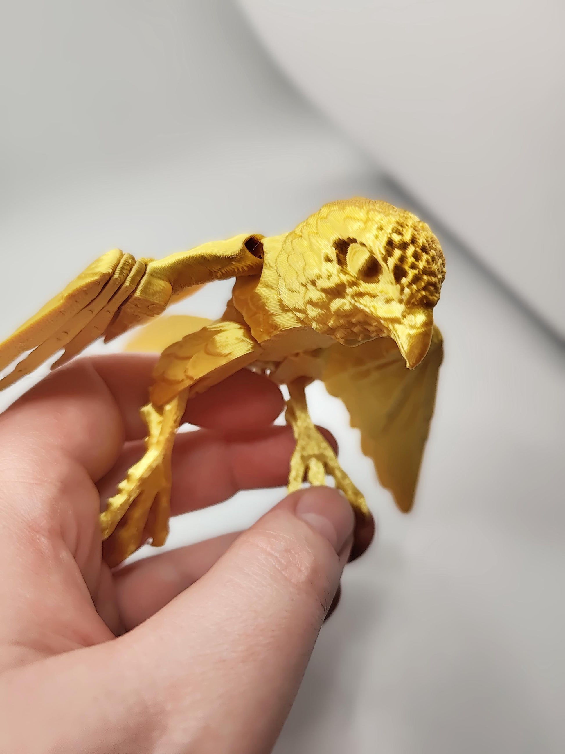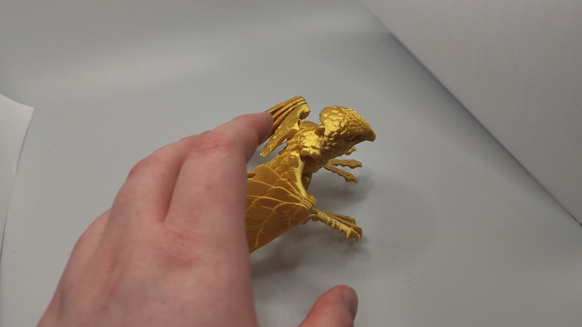 This miniature version of our popular articulated falcon is 3D printed in stunning gold PLA, making it a sleek and eye-catching display piece or fidget toy. Though smaller in size, it still features movable wings, individual feathers, a poseable head, and a flexible tail.