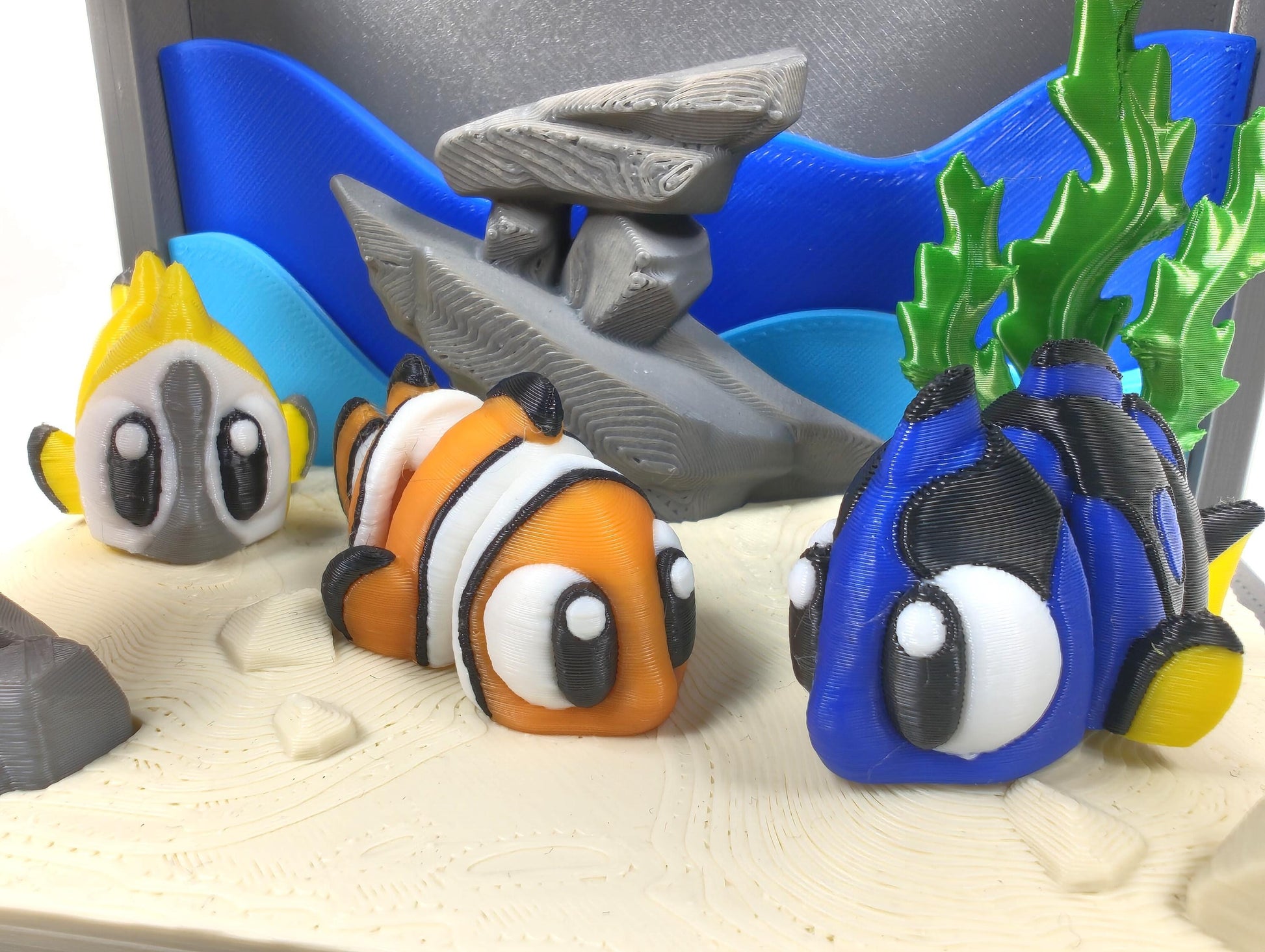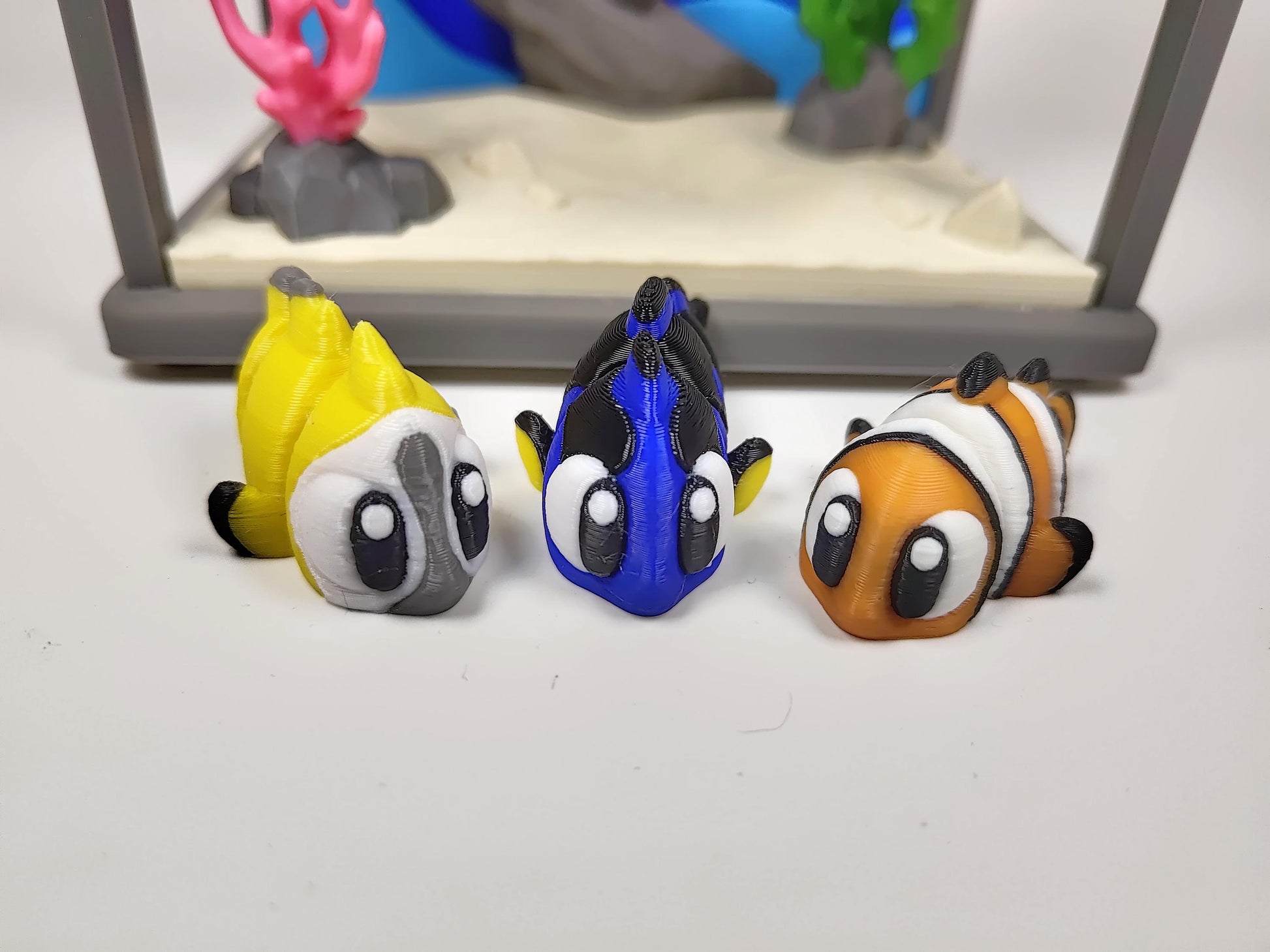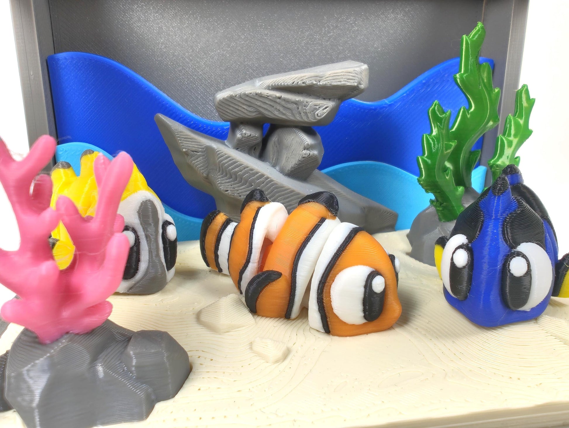 Dive into a world of underwater wonder with Fish Tank Friends – a delightful 3D printed fish tank diorama featuring three fully articulated fidget fish: a vibrant clown fish, a graceful angel fish, and a bold surgeon fish.