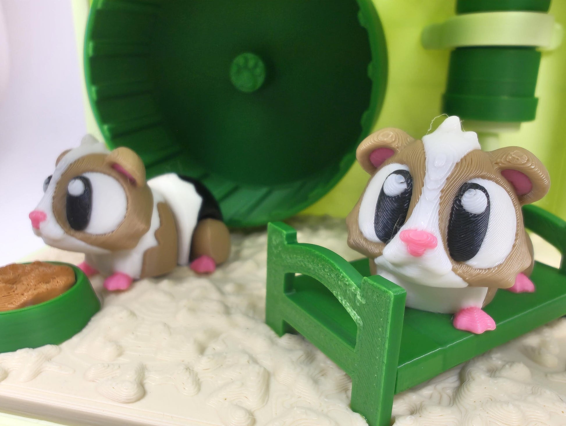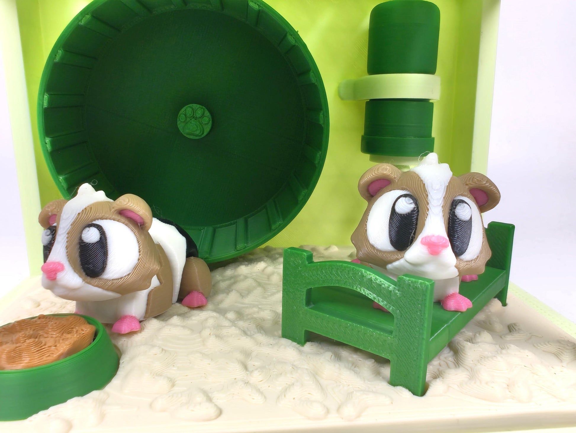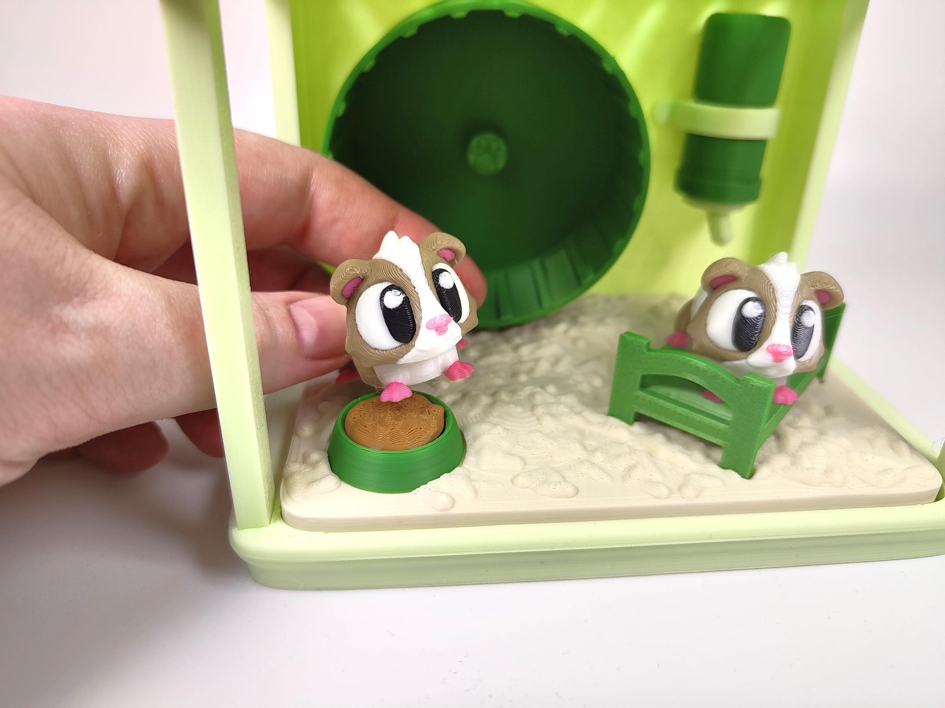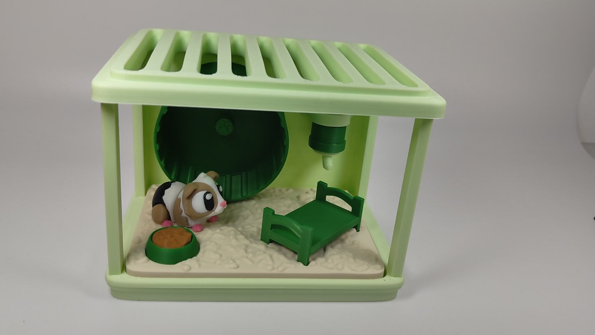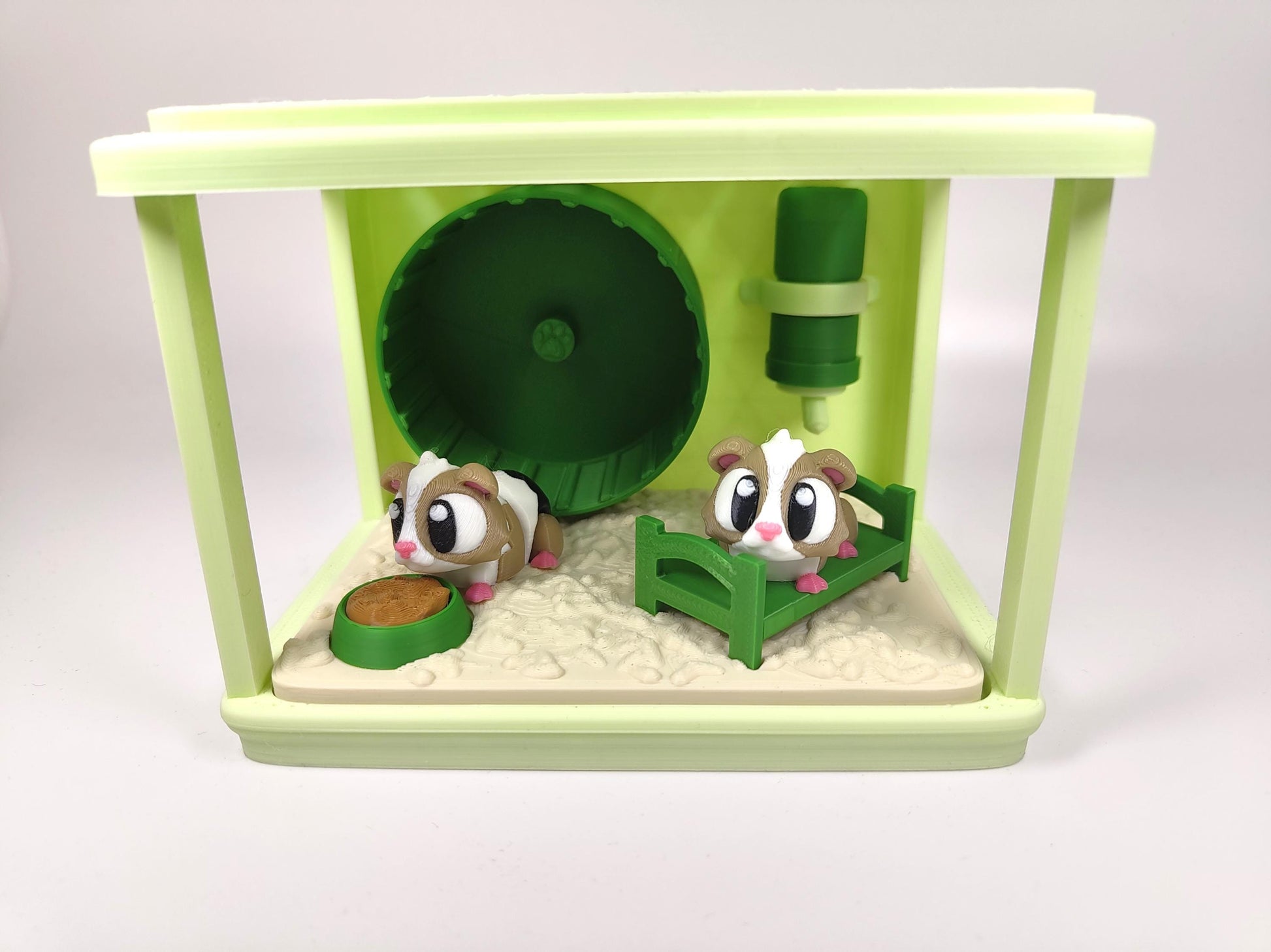 🏡 Interactive Cage Display Designed like a miniature habitat, this diorama includes: - A lovely crisp light green cage enclosure - A spinning exercise wheel - A cosy bed for nap time - A water bottle and food bowl for snack breaks