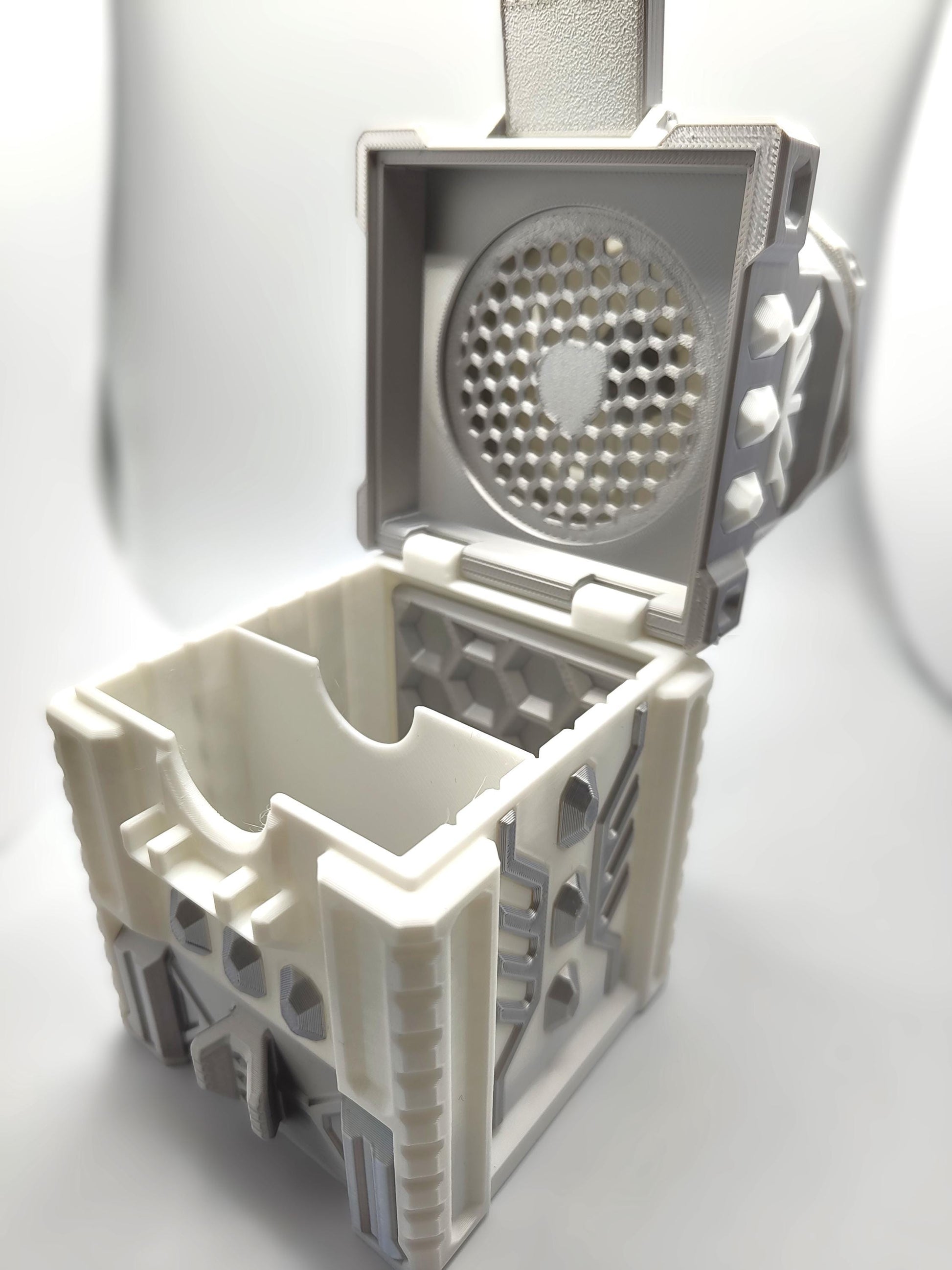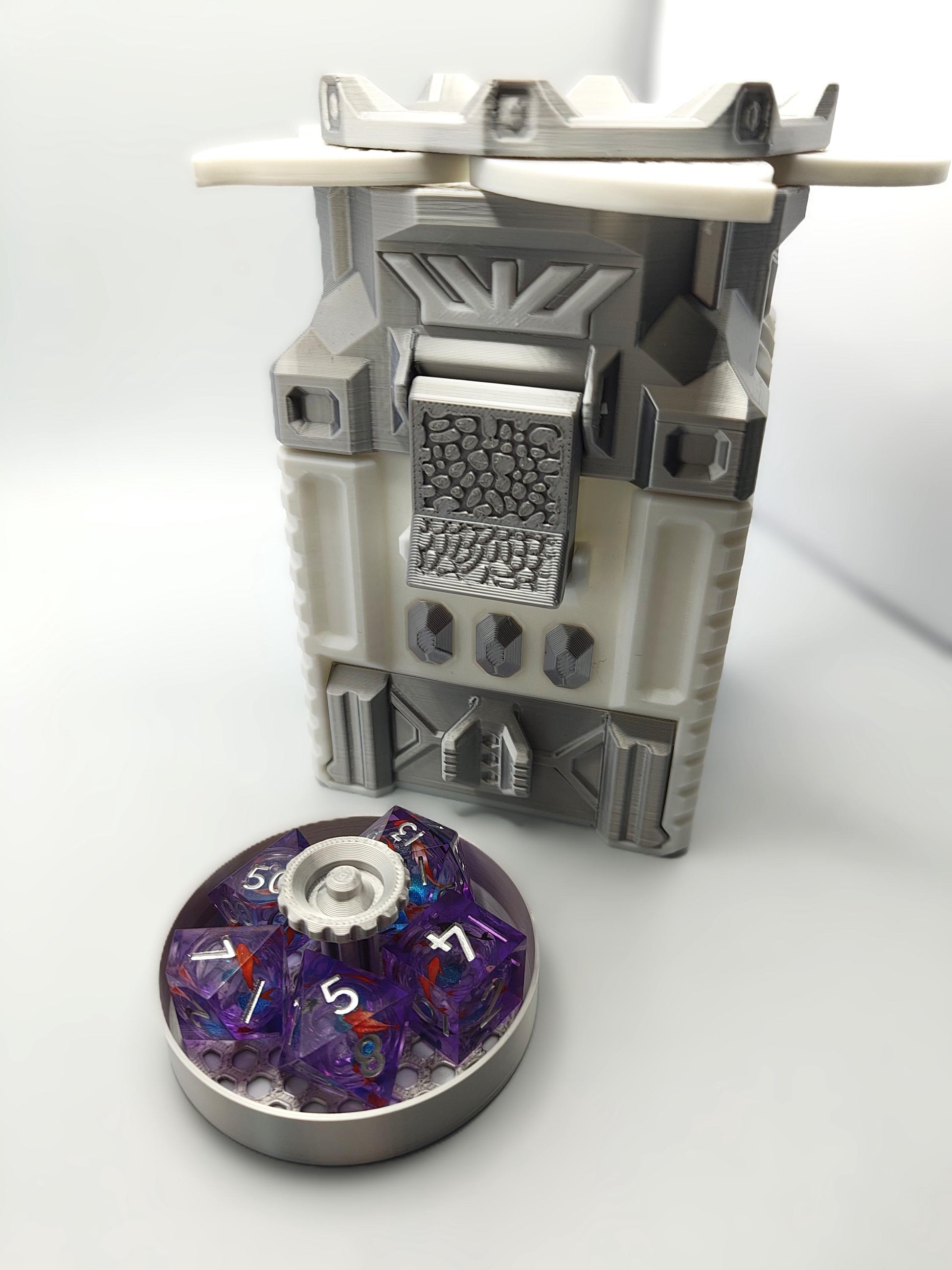 Level up your tabletop game with this ingeniously designed 3D-printed deck box! More than just a card holder, this box features a latching lid, a working iris mechanism, and a removable dice caddy—plus it transforms into a functional dice roller!