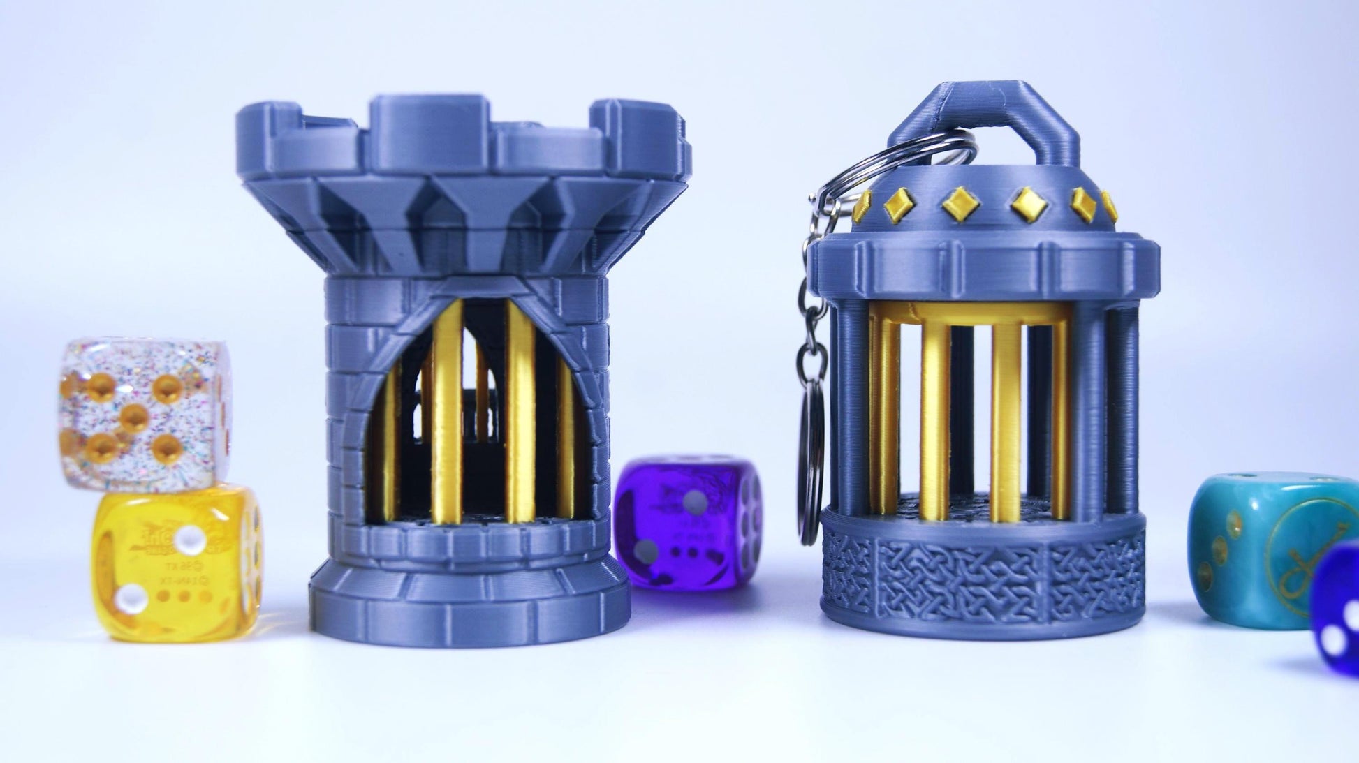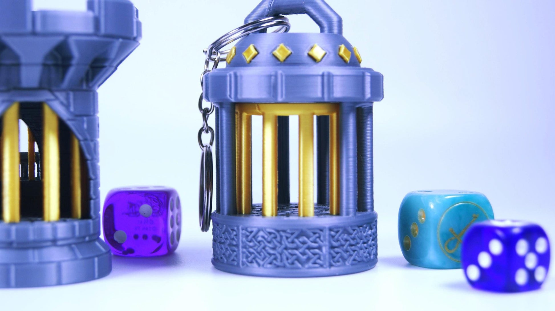 Mechanical Mini Dice Jail Keychain Dice Jail Keyring DnD Dice Jail ā Castle Dice Storage 3D Printed 2 Variants - Portable Dice Prison