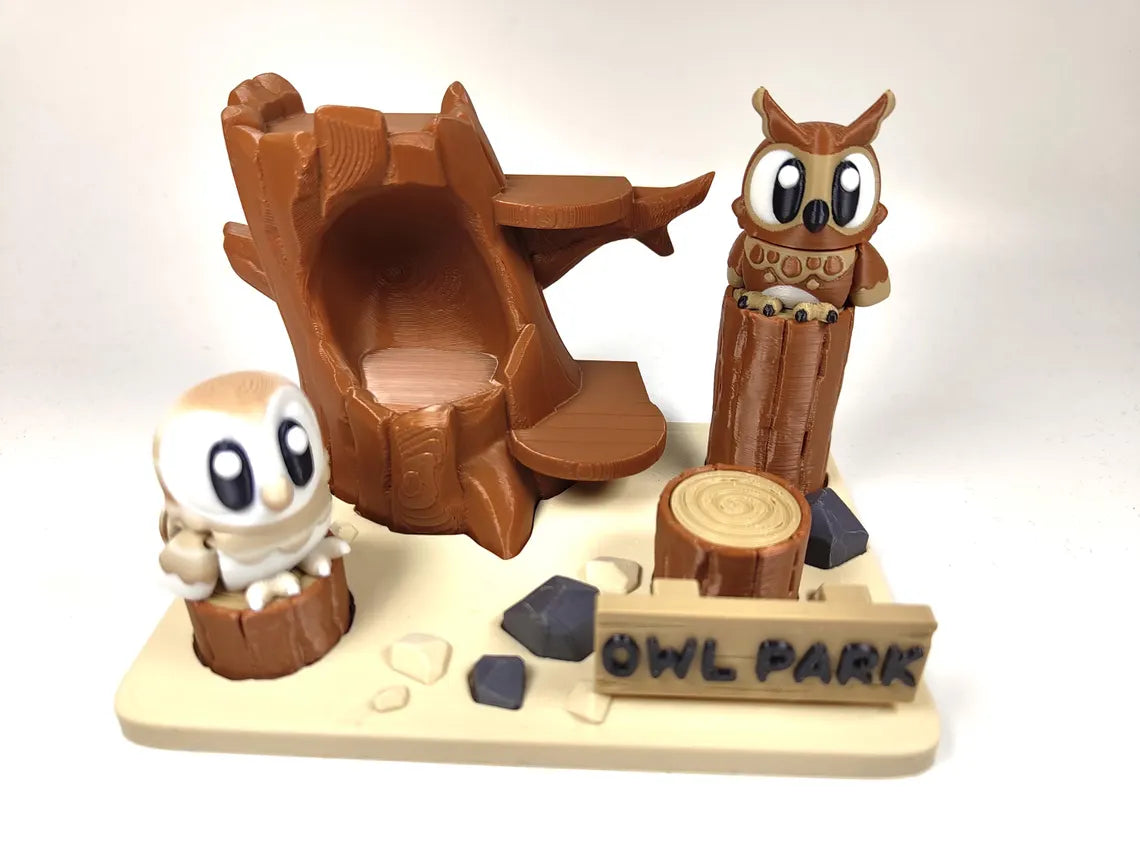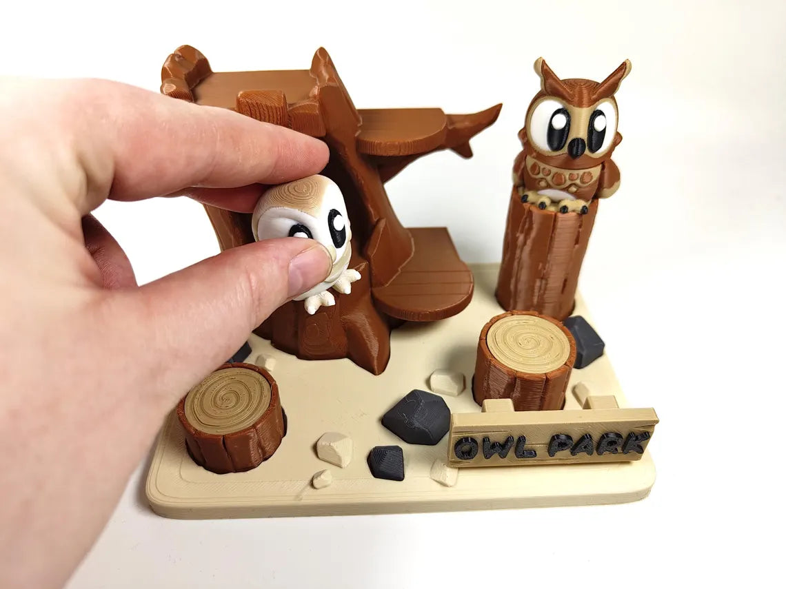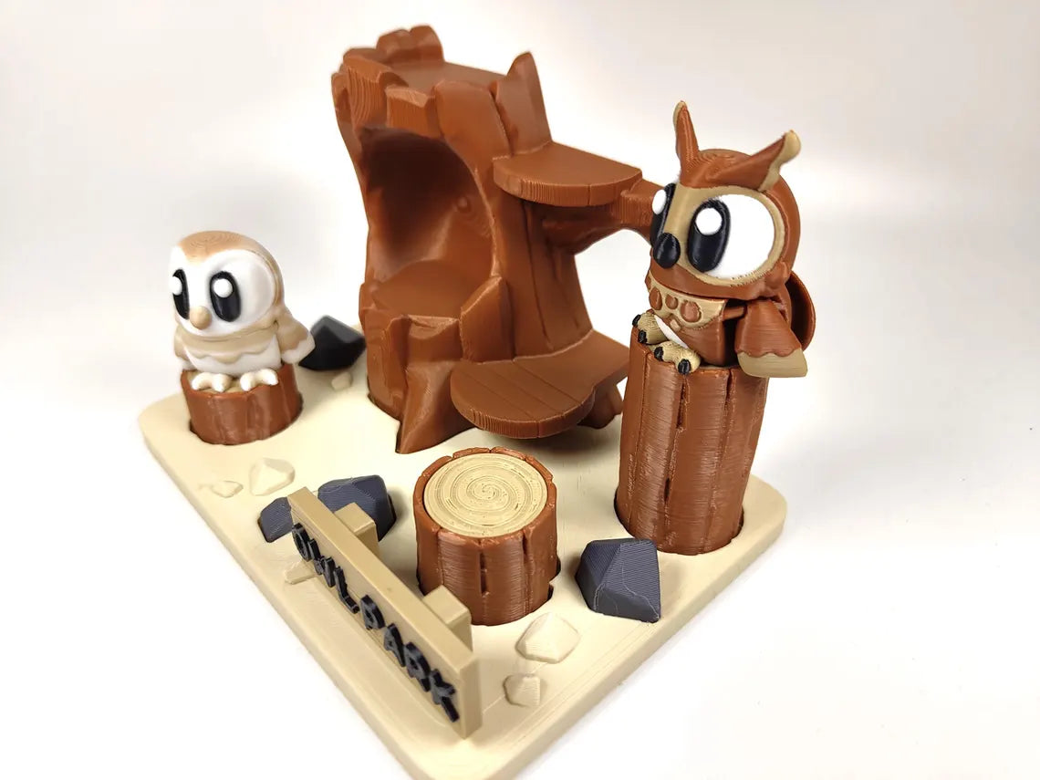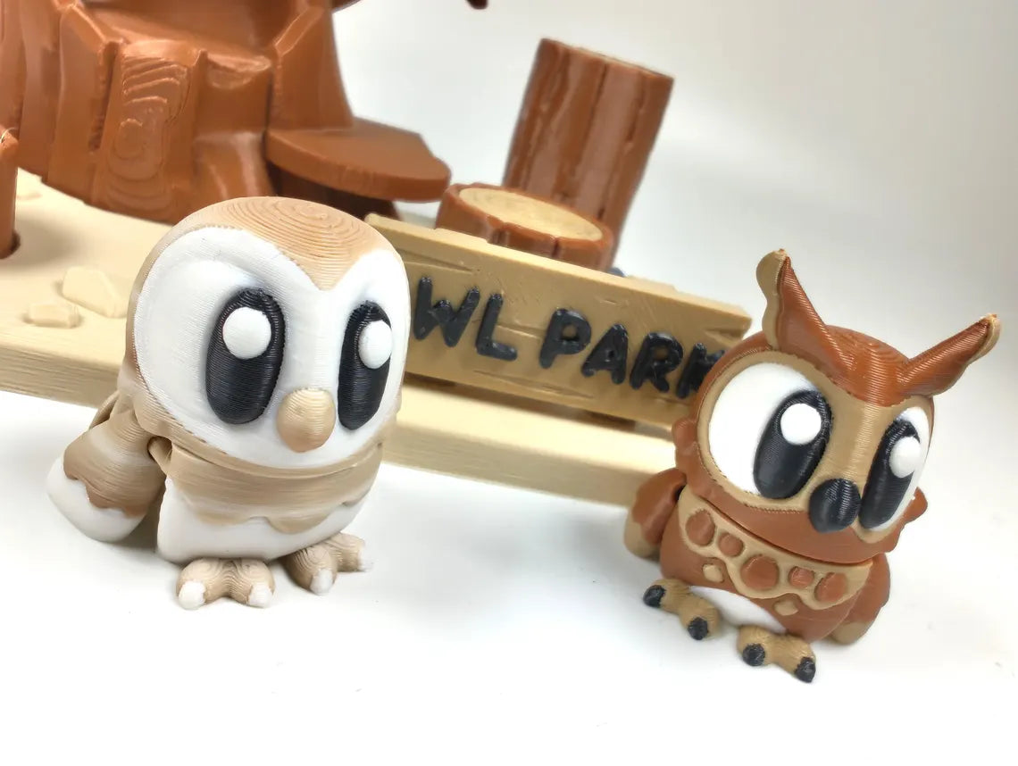 Welcome to Owl Park – a charming 3D-printed diorama set featuring both the Barn Owl and Great Horned Owl, perched peacefully in a natural setting. This delightful scene includes a display base with a central tree and log perches, creating the perfect roost for your articulated owl duo.