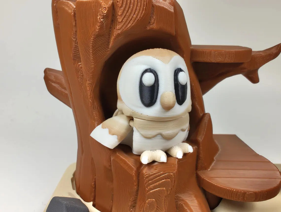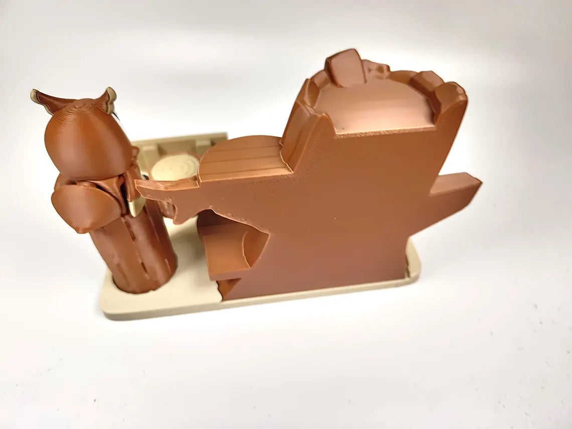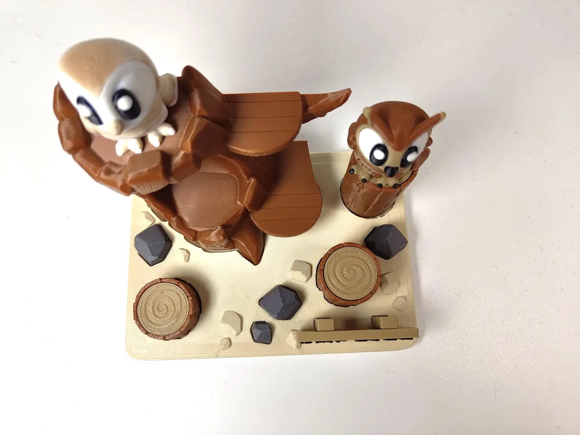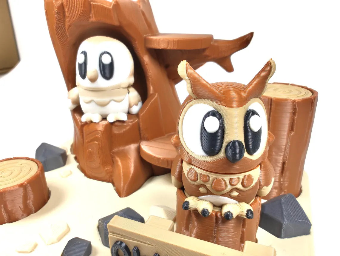 Welcome to Owl Park – a charming 3D-printed diorama set featuring both the Barn Owl and Great Horned Owl, perched peacefully in a natural setting. This delightful scene includes a display base with a central tree and log perches, creating the perfect roost for your articulated owl duo.